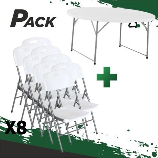 • Pack compuesto por MESA DE RESINA REDONDA PLEGABLE 160X74CM (SG0159) + 8 SILLAS RESINA PLEGABLE 80X50X45CM (SG0157)