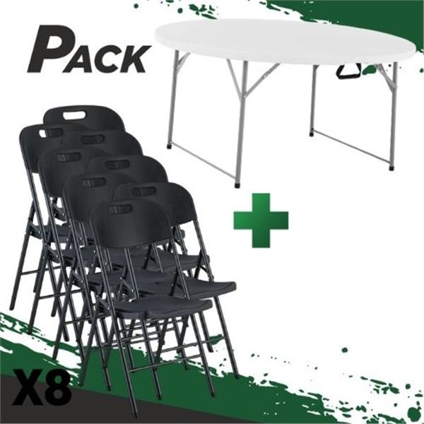 • Pack compuesto por MESA DE RESINA REDONDA PLEGABLE 160X74CM (SG0159) + 8 SILLAS RESINA PLEGABLE PRO NEGRA 44X53X83CM (SG0158)